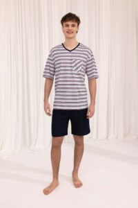 Model wykonany z wysokiej jakości bawełny. Góra w paski z naszytą ozdobną kieszonką i dekoltem w serek. Spodnie gładkie.