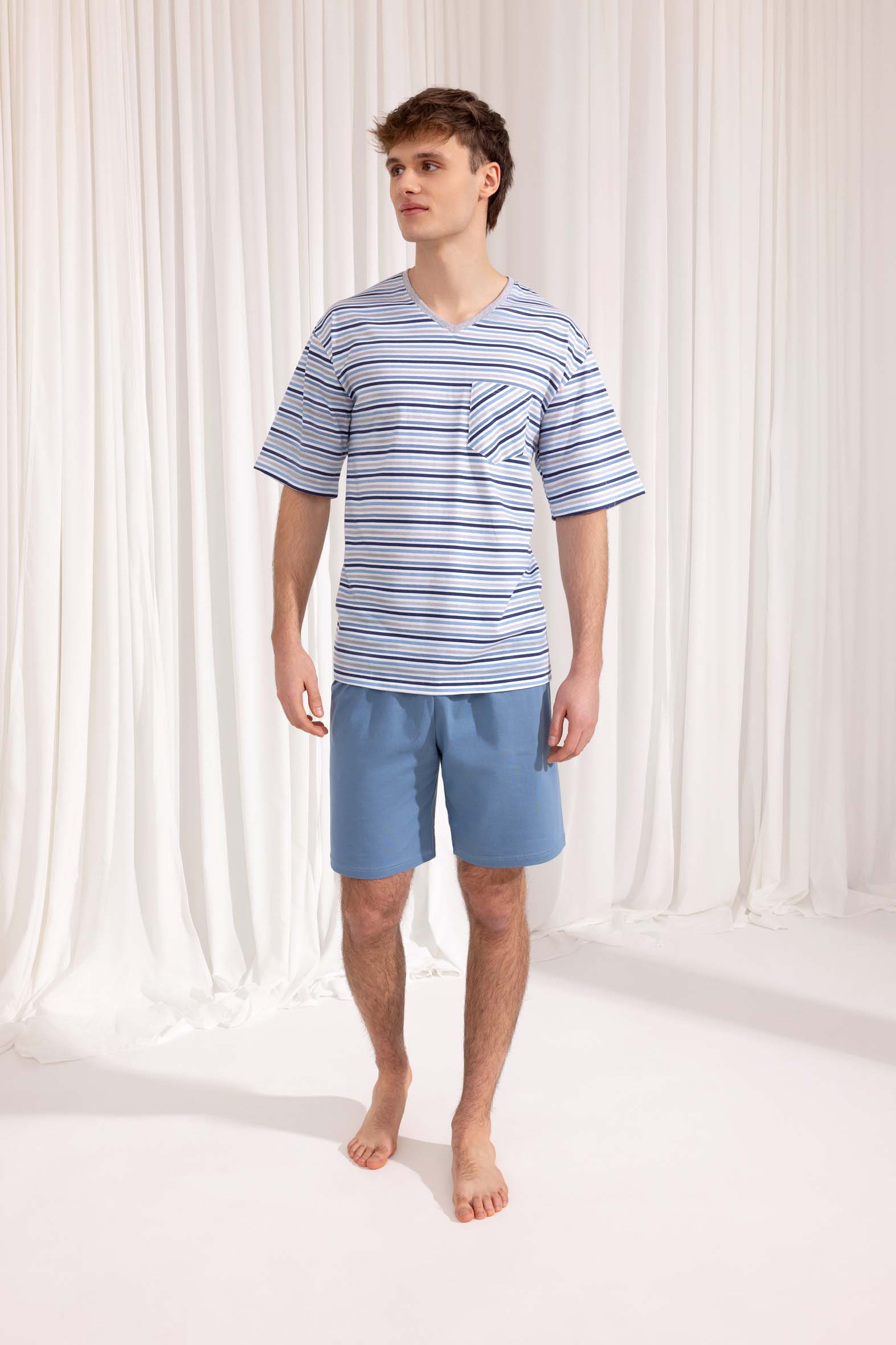 Model wykonany z wysokiej jakości bawełny. Góra w paski z naszytą ozdobną kieszonką i dekoltem w serek. Spodnie gładkie.